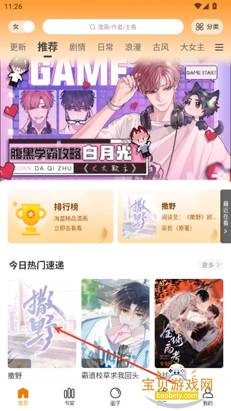 1、进入首页,筛选你喜欢的漫画内容,可以根据类目,或者直接推荐界面进行浏览