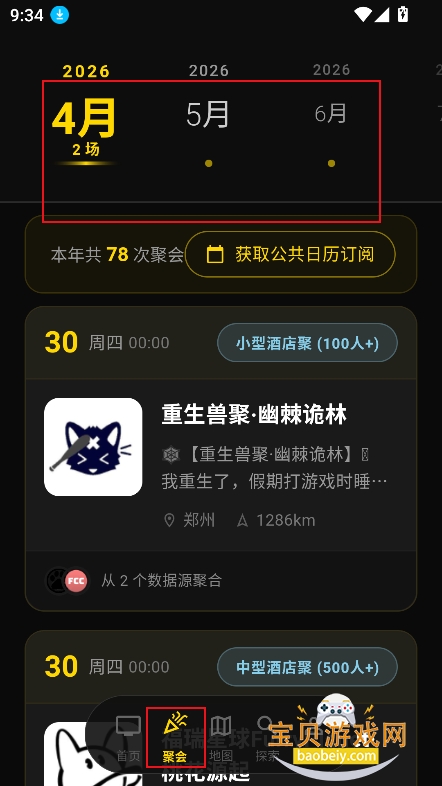 1、进入【聚会】界面,可以查看近期聚会活动,以及场次,地点等
