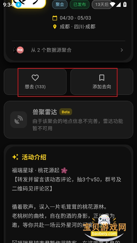 2、进入活动界面,可以勾选想去,了解活动明细,还能够添加行程