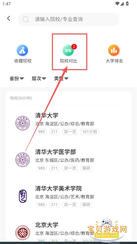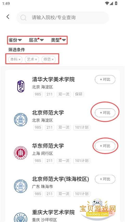 4、可通过搜索/筛选(省份、层次、类型等)找到目标院校,点击院校右侧的"+对比",将其加入对比列表;