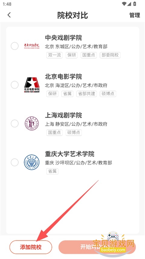 3、点击左下角添加需要对比的院校;