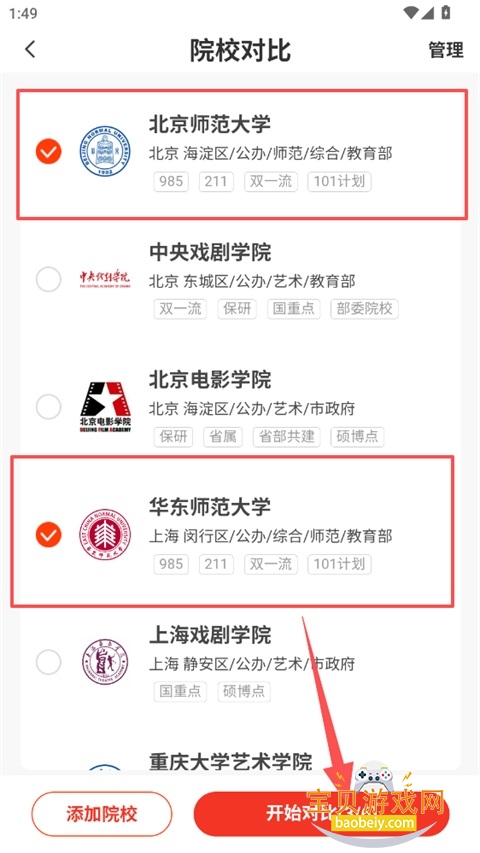 5、勾选需要对比的院校,点击开始对比;