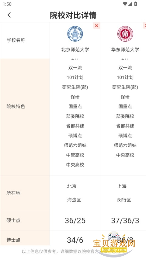 6、进入院校对比详情页,即可查看多所院校的特色、所在地、硕博点等维度的详细对比信息。