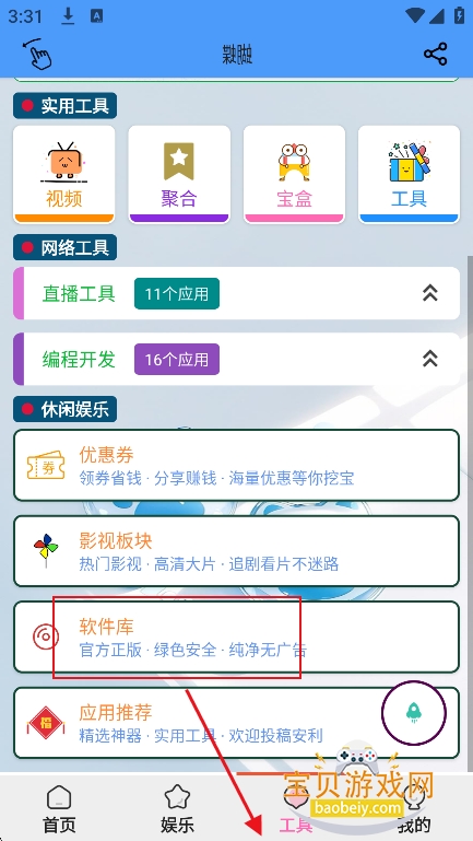 1、进入【工具】界面,选择【软件库】