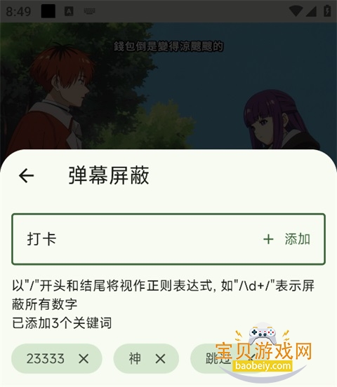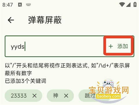 4、输入你想屏蔽的关键词或正则表达式,即可屏蔽弹幕内容。