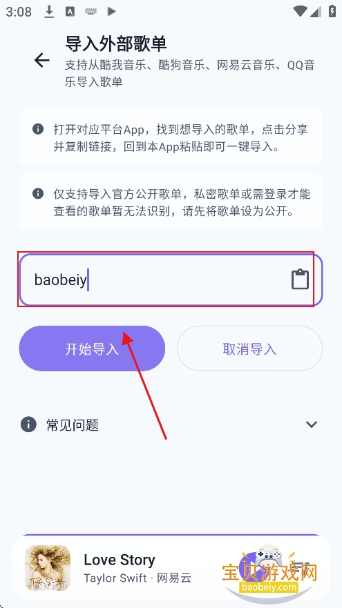 输入歌单地址,口令等,点击【开始导入】