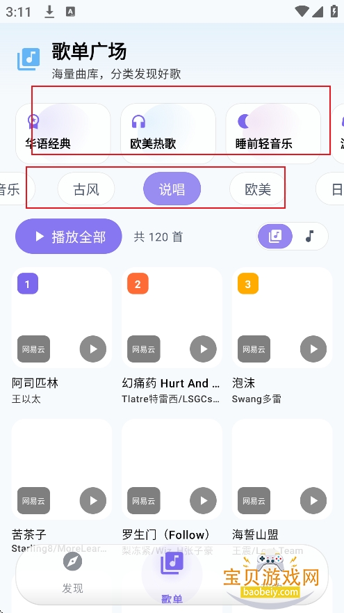 2、进入歌单界面,可以根据歌曲分类,听歌类型等筛选喜欢的音乐