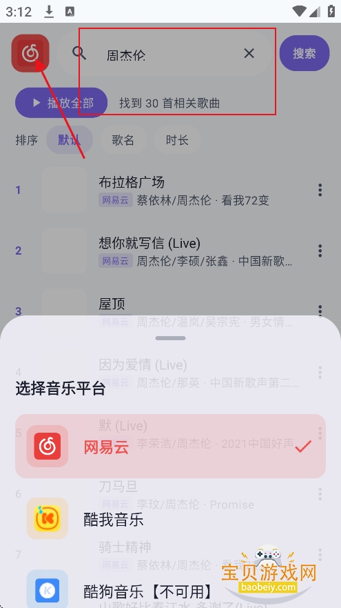4、或者进入搜索界面,选择音乐平台,搜索框输入歌手名,歌曲名,精准检索