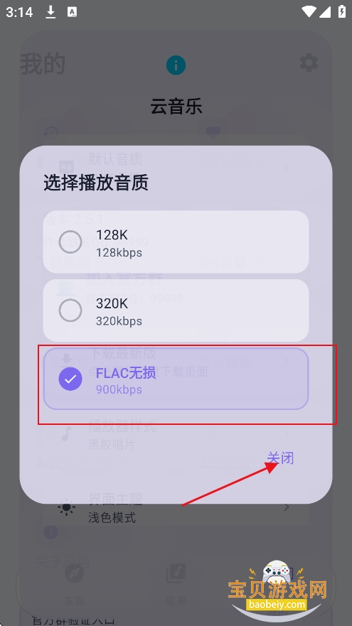 3、勾选无损音质,点击【关闭】返回听歌界面即可