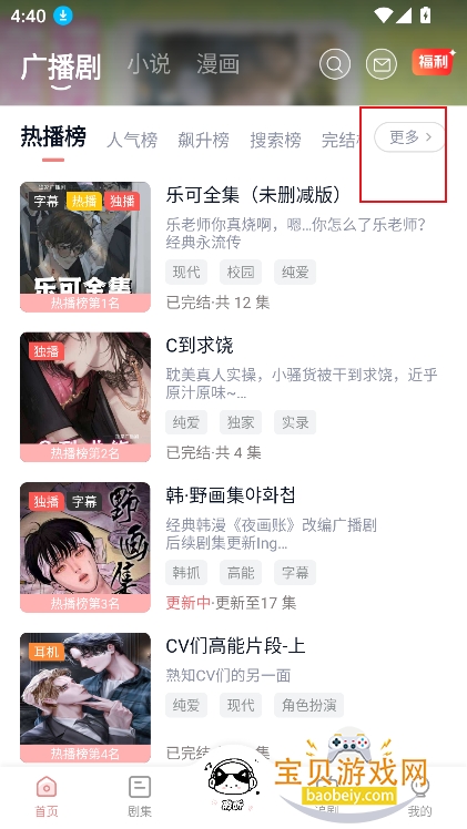 2、点击右上角【更多】进入,还能够发现更多广播剧内容