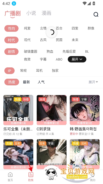 1、进入首页,可以直接切换到【广播剧】板块,根据排行分类,以及关键词标签进行筛选喜欢的广播剧类型