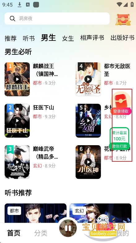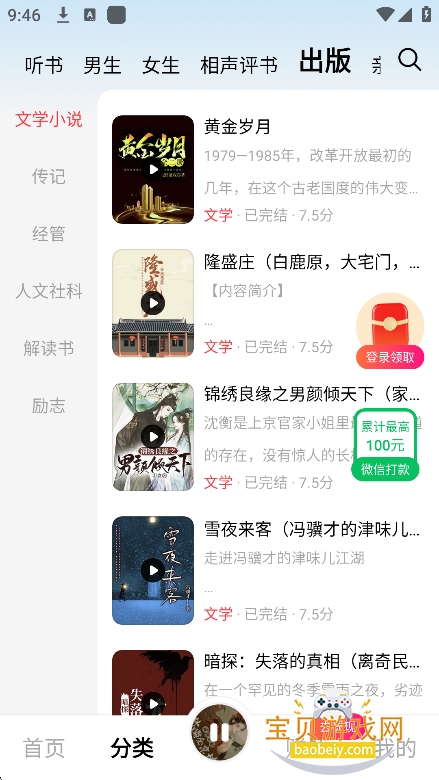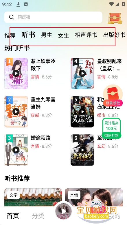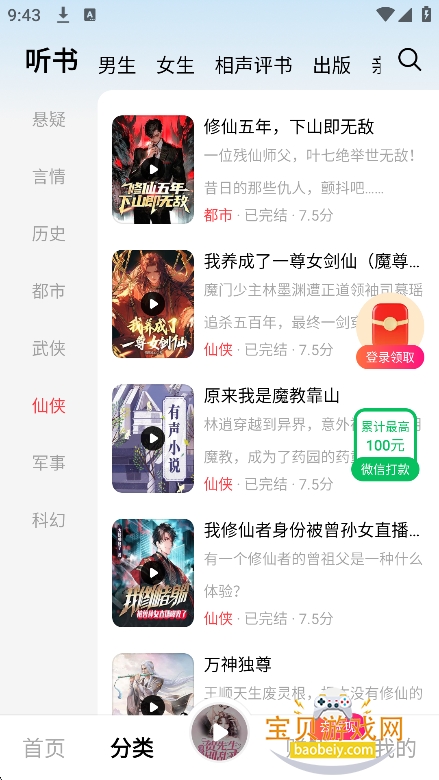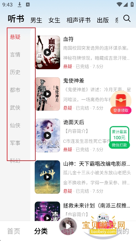 2、进入【分类】板块,还有更详细的听书类型,以及听书分类,题材等
