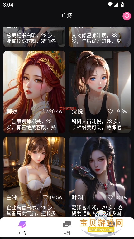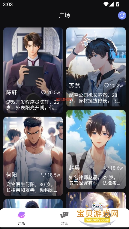 1、进入角色广场,筛选喜欢的虚拟角色