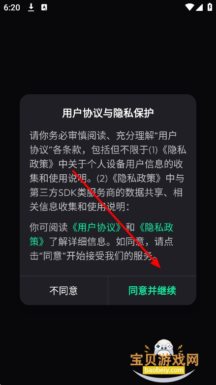 1、在宝贝游戏网下载安装,首次进入点击【同意并继续】