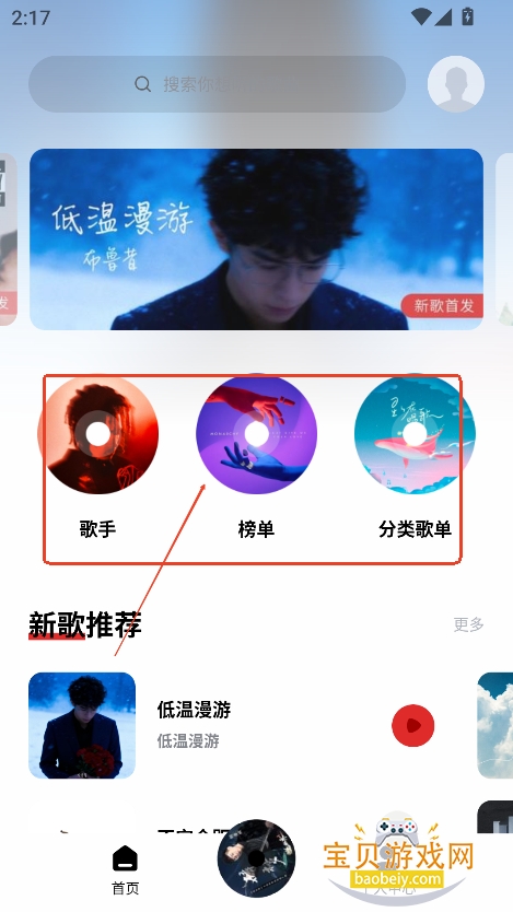 1、进入首页,提供歌单,歌手,分类歌单等多个板块的内容,可以任意筛选歌手歌单