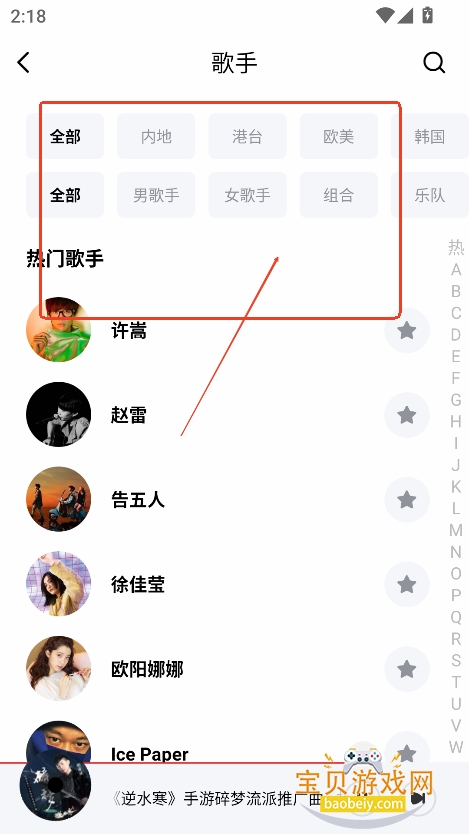 2、例如进入歌手界面,提供大部分人气歌手,可以根据歌手筛选歌曲