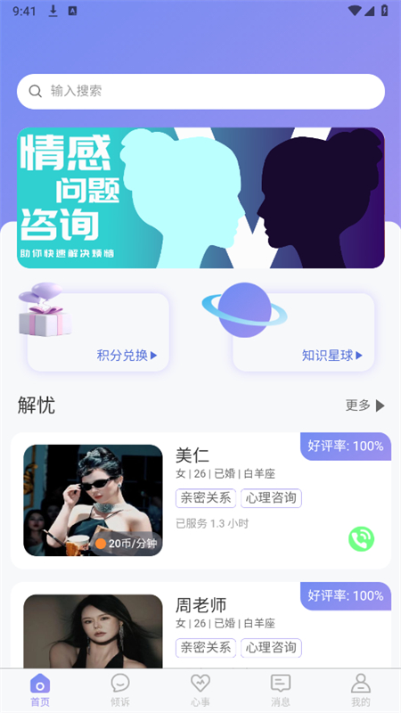 一对一情感咨询:提供一对一的情感咨询服务,由专业导师倾听并解答用户的情感问题。